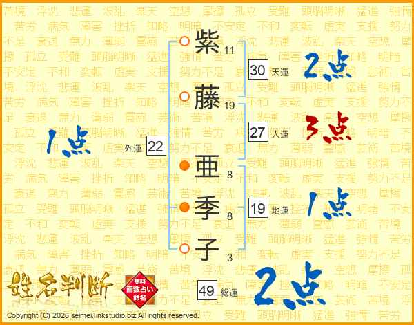 紫藤亜季子さんの総運は49画の2点!