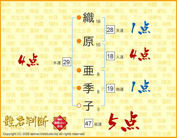 織原亜季子さんの総運は47画の5点!