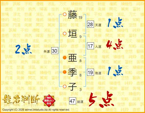 藤(19画)垣(9画) 亜(8画)季(8画)子(3画)
