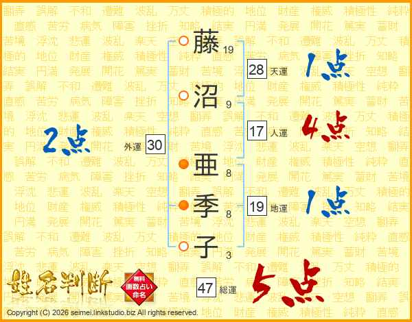 藤沼亜季子さんの総運は47画の5点!