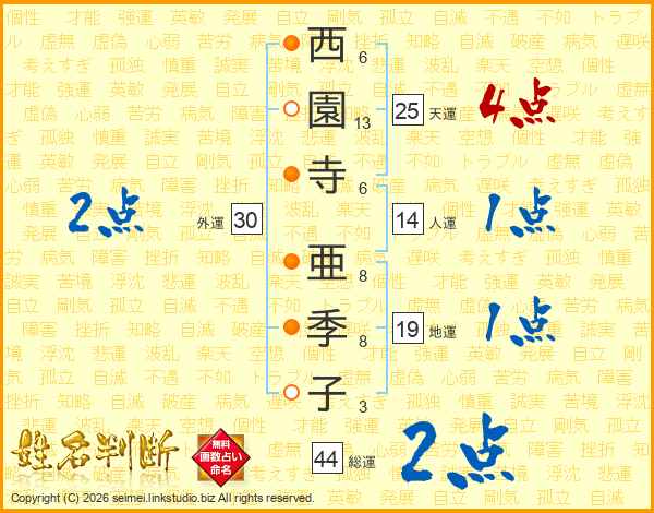 西(6画)園(13画)寺(6画) 亜(8画)季(8画)子(3画)