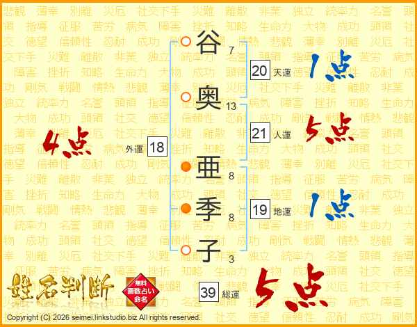 谷(7画)奥(13画) 亜(8画)季(8画)子(3画)