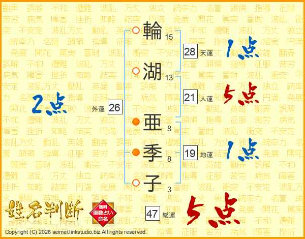 輪湖亜季子さんの総運は47画の5点!