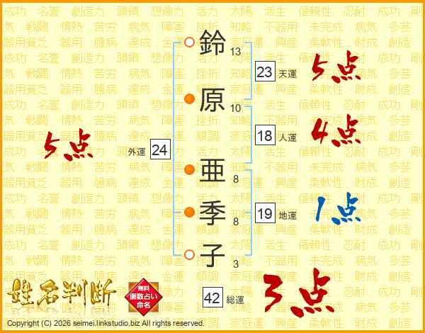 鈴原亜季子さんの天運は23画の5点!