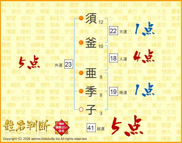 須(12画)釜(10画) 亜(8画)季(8画)子(3画)