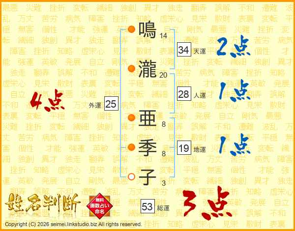 鳴(14画)瀧(20画) 亜(8画)季(8画)子(3画)