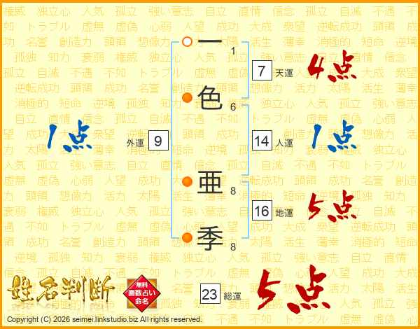 生活面を象徴する運勢です。外部から受ける影響力を表し、結婚運、家庭運や職場、環境への順応性を表します。総運から人運を引いた画数。姓や名が1文字の場合を除く。