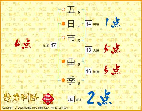 五(5画)日(4画)市(5画) 亜(8画)季(8画)