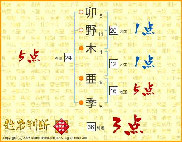 卯(5画)野(11画)木(4画) 亜(8画)季(8画)