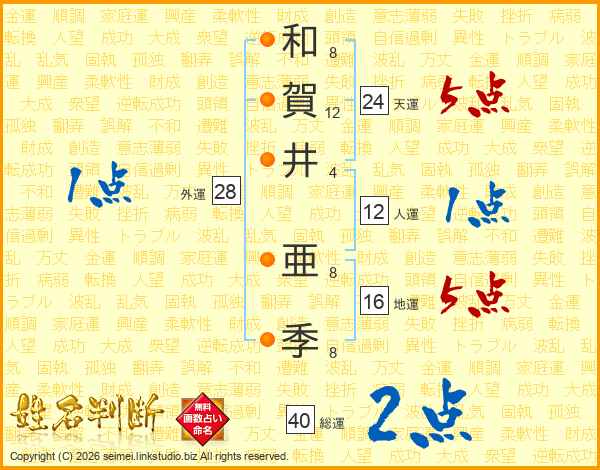和(8画)賀(12画)井(4画) 亜(8画)季(8画)