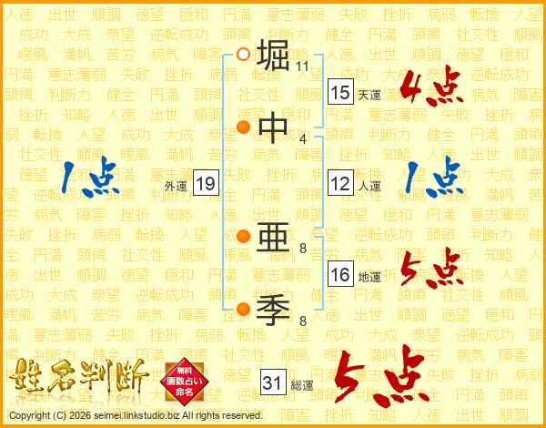 生活面を象徴する運勢です。外部から受ける影響力を表し、結婚運、家庭運や職場、環境への順応性を表します。総運から人運を引いた画数。姓や名が1文字の場合を除く。