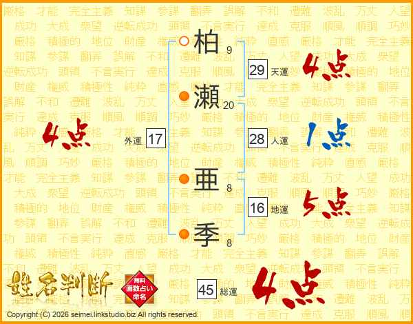 柏(9画)瀬(20画) 亜(8画)季(8画)