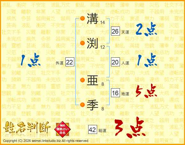 あなたの人生を表す1番重要な運勢です。生涯を通じて影響する総合運となり、主に50歳以降の晩年期に影響を及ぼします。苗字と名前の合計画数。