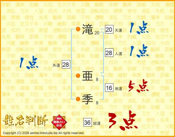 生活面を象徴する運勢です。外部から受ける影響力を表し、結婚運、家庭運や職場、環境への順応性を表します。総運から人運を引いた画数。姓や名が1文字の場合を除く。