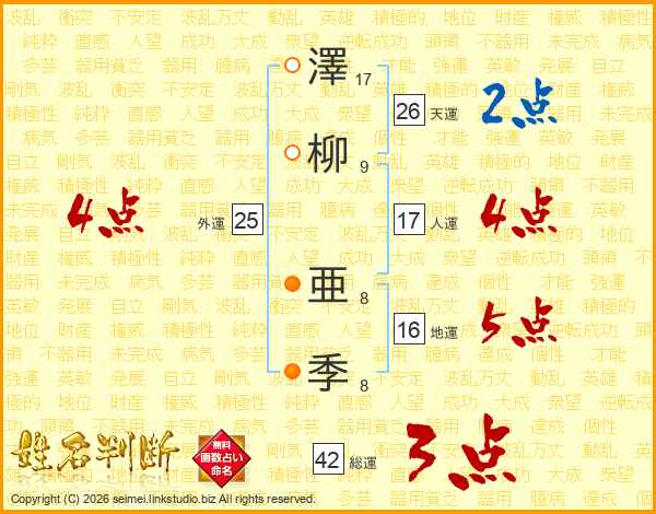 澤(17画)柳(9画) 亜(8画)季(8画)