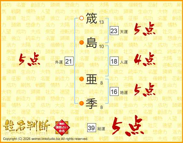 あなたの人生を表す1番重要な運勢です。生涯を通じて影響する総合運となり、主に50歳以降の晩年期に影響を及ぼします。苗字と名前の合計画数。
