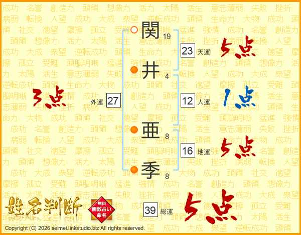 関(19画)井(4画) 亜(8画)季(8画)
