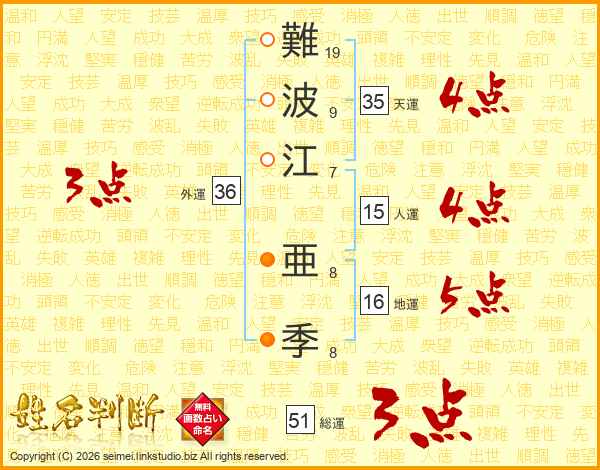 難(19画)波(9画)江(7画) 亜(8画)季(8画)