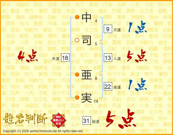 生活面を象徴する運勢です。外部から受ける影響力を表し、結婚運、家庭運や職場、環境への順応性を表します。総運から人運を引いた画数。姓や名が1文字の場合を除く。