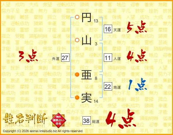 生活面を象徴する運勢です。外部から受ける影響力を表し、結婚運、家庭運や職場、環境への順応性を表します。総運から人運を引いた画数。姓や名が1文字の場合を除く。
