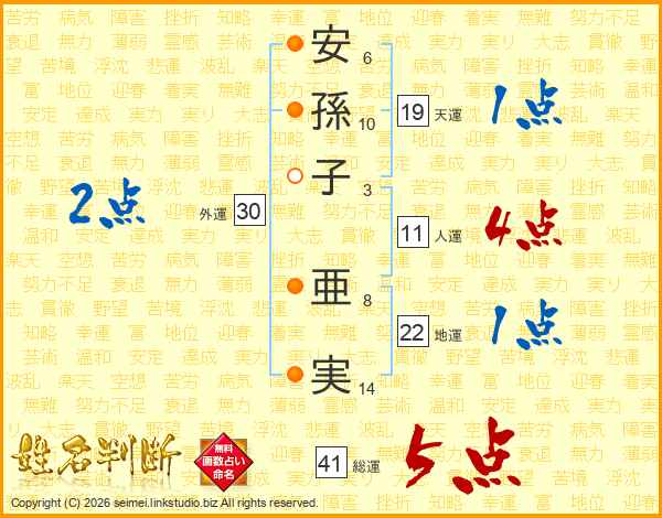 安(6画)孫(10画)子(3画) 亜(8画)実(14画)