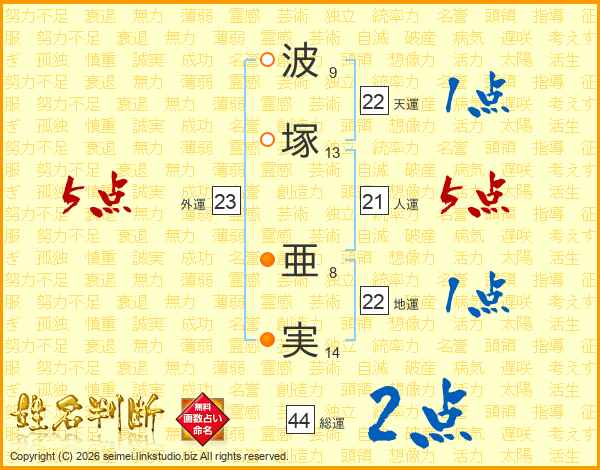 生活面を象徴する運勢です。外部から受ける影響力を表し、結婚運、家庭運や職場、環境への順応性を表します。総運から人運を引いた画数。姓や名が1文字の場合を除く。