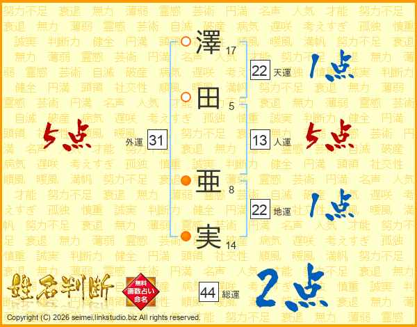 生活面を象徴する運勢です。外部から受ける影響力を表し、結婚運、家庭運や職場、環境への順応性を表します。総運から人運を引いた画数。姓や名が1文字の場合を除く。