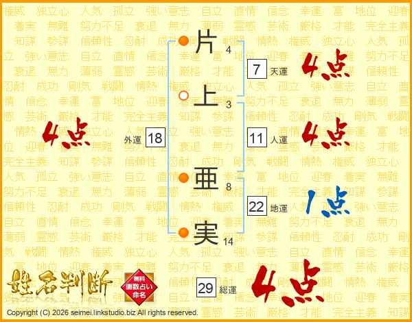 生活面を象徴する運勢です。外部から受ける影響力を表し、結婚運、家庭運や職場、環境への順応性を表します。総運から人運を引いた画数。姓や名が1文字の場合を除く。