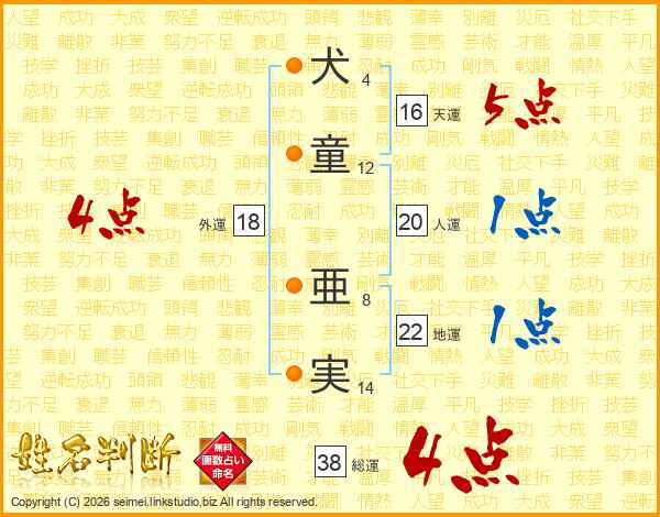 あなたの人生を表す1番重要な運勢です。生涯を通じて影響する総合運となり、主に50歳以降の晩年期に影響を及ぼします。苗字と名前の合計画数。