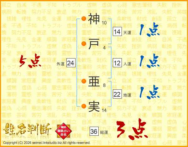 生活面を象徴する運勢です。外部から受ける影響力を表し、結婚運、家庭運や職場、環境への順応性を表します。総運から人運を引いた画数。姓や名が1文字の場合を除く。