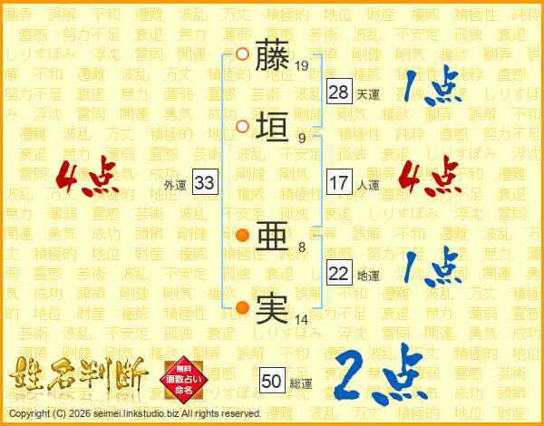 藤(19画)垣(9画) 亜(8画)実(14画)
