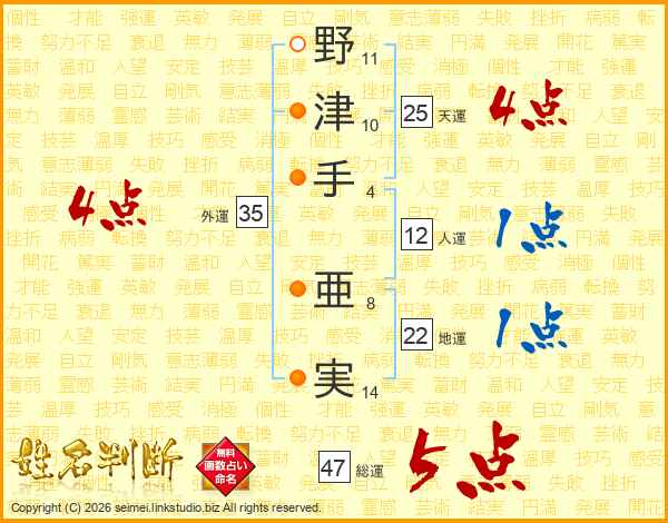 野(11画)津(10画)手(4画) 亜(8画)実(14画)