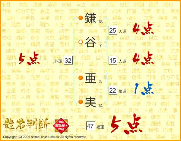 生活面を象徴する運勢です。外部から受ける影響力を表し、結婚運、家庭運や職場、環境への順応性を表します。総運から人運を引いた画数。姓や名が1文字の場合を除く。
