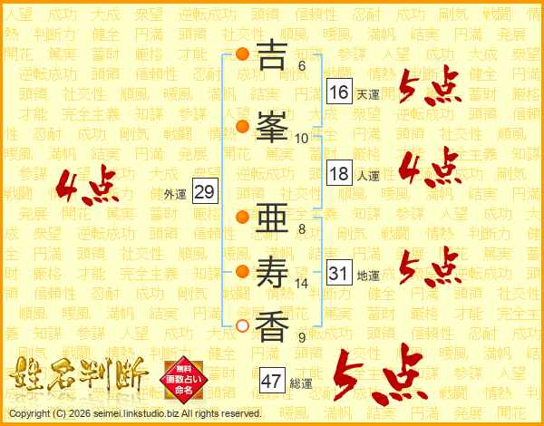 吉(6画)峯(10画) 亜(8画)寿(14画)香(9画)