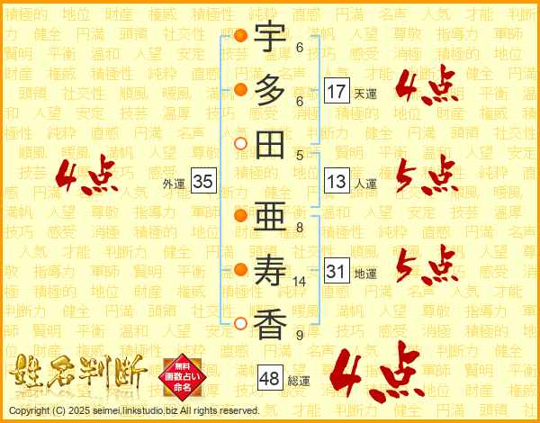 宇(6画)多(6画)田(5画) 亜(8画)寿(14画)香(9画)