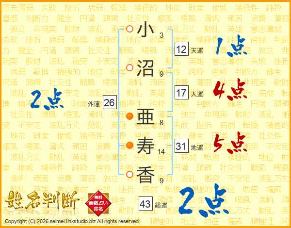 小(3画)沼(9画) 亜(8画)寿(14画)香(9画)