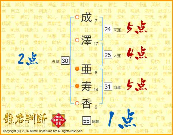 成(7画)澤(17画) 亜(8画)寿(14画)香(9画)