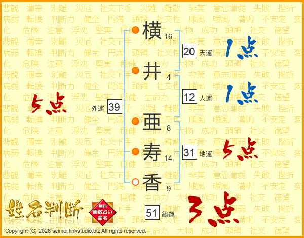 横井亜寿香さんの外運は39画の5点!