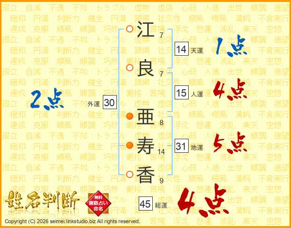 江(7画)良(7画) 亜(8画)寿(14画)香(9画)