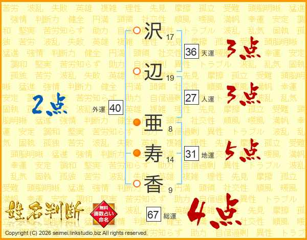 沢辺亜寿香さんの総運は67画の4点!