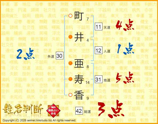 町(7画)井(4画) 亜(8画)寿(14画)香(9画)
