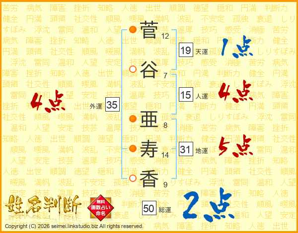 菅(12画)谷(7画) 亜(8画)寿(14画)香(9画)