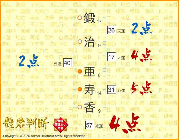 鍛(17画)治(9画) 亜(8画)寿(14画)香(9画)
