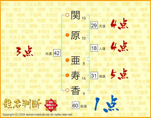 関(19画)原(10画) 亜(8画)寿(14画)香(9画)