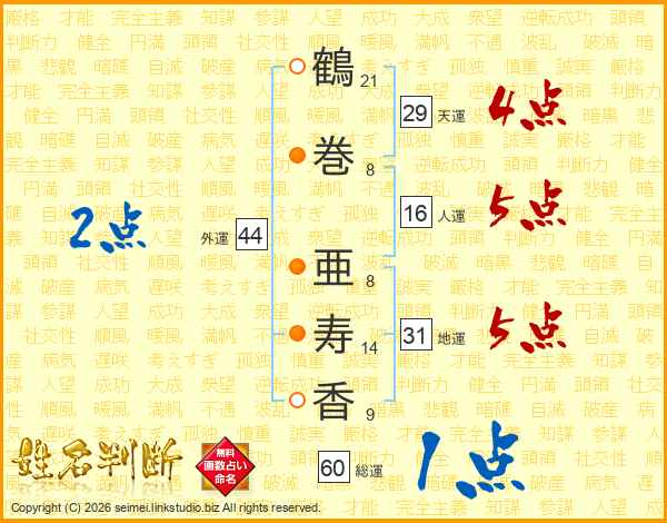 鶴(21画)巻(8画) 亜(8画)寿(14画)香(9画)