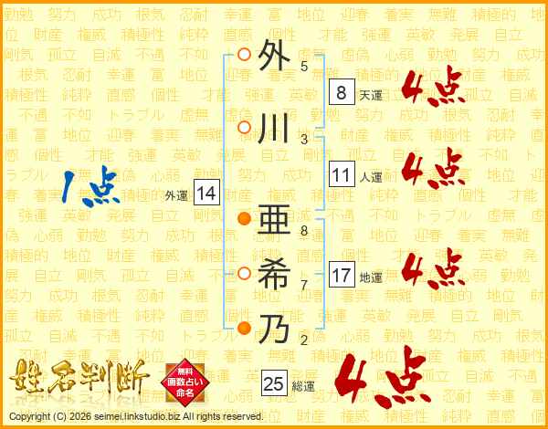 生活面を象徴する運勢です。外部から受ける影響力を表し、結婚運、家庭運や職場、環境への順応性を表します。総運から人運を引いた画数。姓や名が1文字の場合を除く。