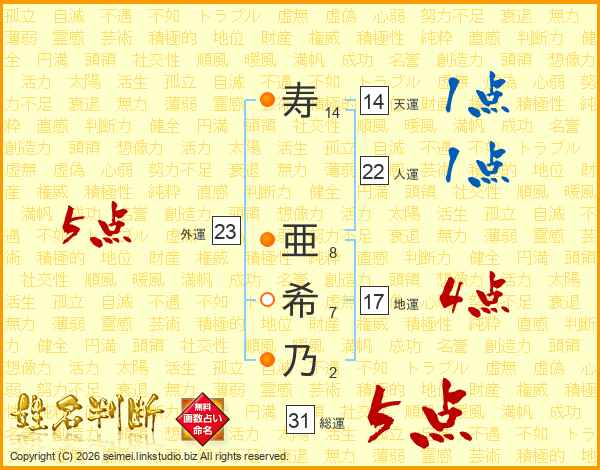 寿(14画) 亜(8画)希(7画)乃(2画)