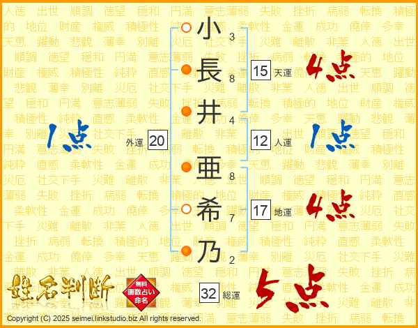 小(3画)長(8画)井(4画) 亜(8画)希(7画)乃(2画)