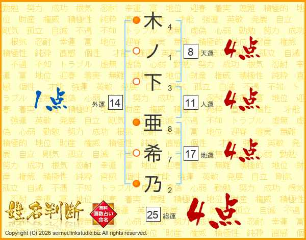 木ノ下亜希乃さんの総運は25画の4点!
