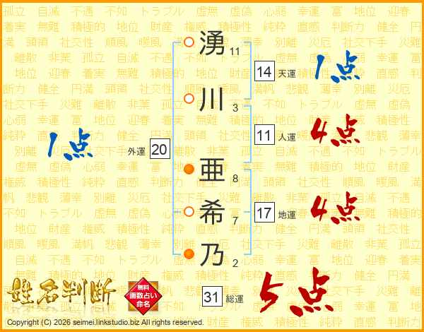 湧(11画)川(3画) 亜(8画)希(7画)乃(2画)